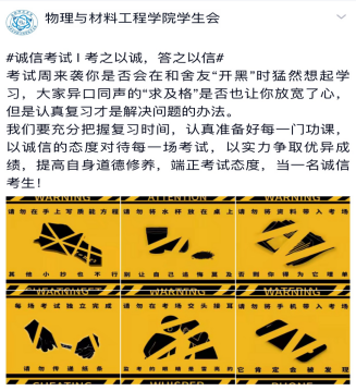 拓宽诚信教育平台,强化教育实效。学院创新工作形式,开展以诚信考试为主题的特色活动。利用微信公众号等新媒体形式,推出诚信教育主题宣传,设置用图文并茂的形式、更易于接受的语言,加深学生对“学以载道,诚信为本”的认知。