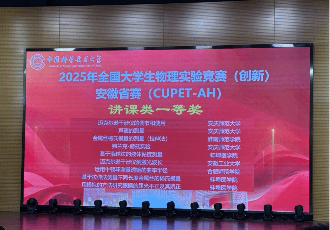 8月30日—9月1日,由安徽省大学物理课程教学指导委员会、安徽省物理学会和安徽省高校大学生物理实验竞赛组织委员会主办,中国科学技术大学物理学院承办的第一届安徽省高校大学生物理实验竞赛(创新)决赛(CUPET—AH)在中国科学技术大学举办,省内26所高校的272支队伍参与决赛角逐。我校威廉希尔足球指数网派出的9支代表队参加,经过省赛初赛和决赛,获得一等奖1项,二等奖2项,三等奖5项。不仅开辟了新征程,更是以敢打敢拼的精神、优异的成绩凸显了学校近年来在大学物理及实验的教学创新和人才培养上取得的显著成效。