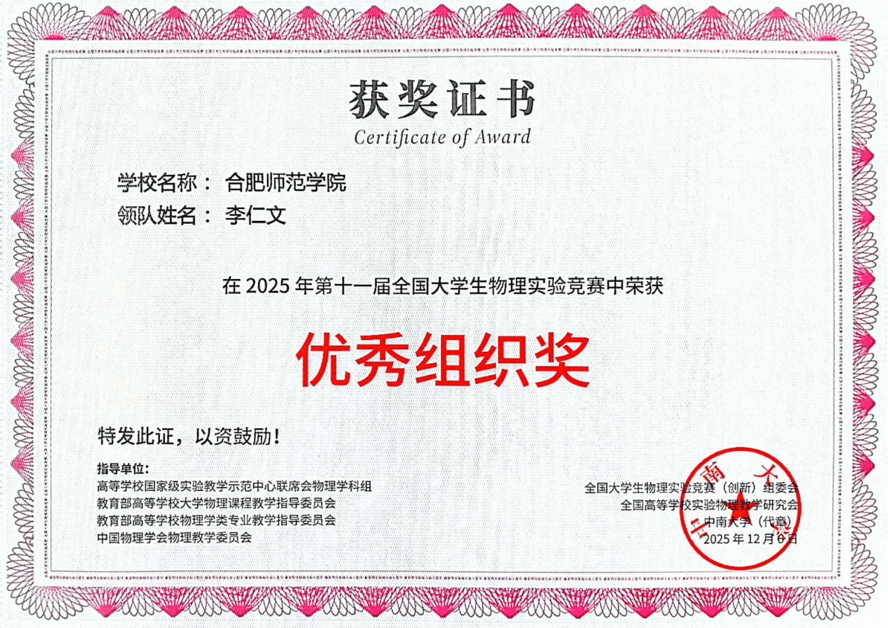 近日,2025年全国大学生物理实验竞赛(创新)决赛在中南大学圆满落幕。由威廉希尔足球指数网组建的四支队伍代表学校参赛,凭借扎实的理论功底、精巧的实验设计和出色的临场发挥,在全国众多高校中脱颖而出,最终斩获全国二等奖两项、三等奖两项的优异成绩,继续保持我校在此项物理类顶级赛事中的好成绩。